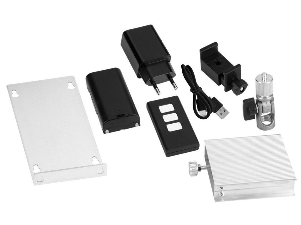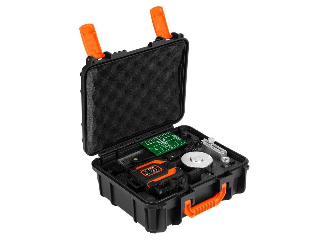 3D laser, prenosný kufor, 2x Li-Ion akumulátor, diaľkové ovládanie, magnetický držiak, cieľová platnička, zdvíhacia plošina (výťah), nabíjačka s USB káblom a sada statívových adaptérov