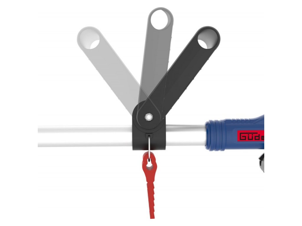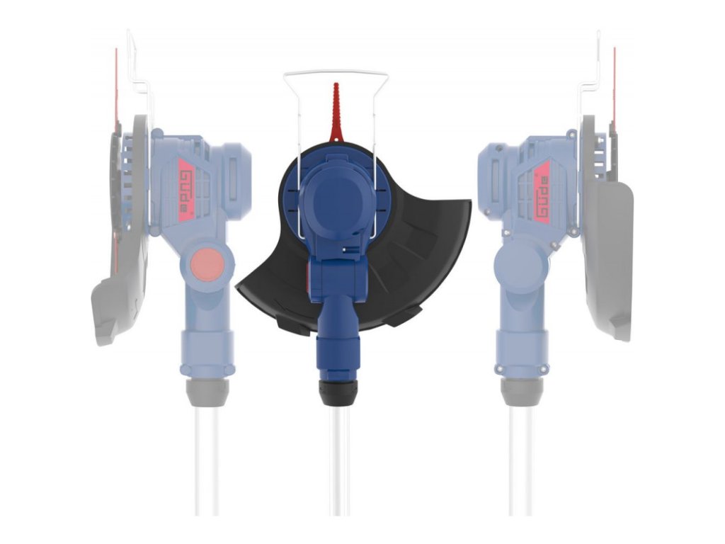 Akumulátorový vyžínač so systémom batérie 18V E³. Dvojité nože pre efektívnu prácu, trimovacia hlava otočná o 180° a sklopná do 5 polôh, teleskopická rukoväť, prídavná rukoväť, uloženie náhradných nožov v prídavnej rukoväti, strmeň pre ochranu rastlín, Softgrip rukoväť.