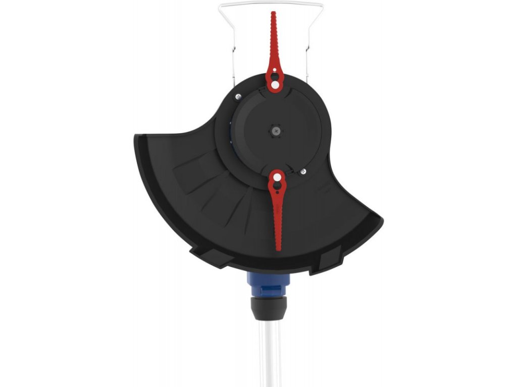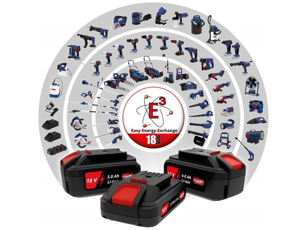 Akumulátorový vyžínač so systémom batérie 18V E³. Dvojité nože pre efektívnu prácu, trimovacia hlava otočná o 180° a sklopná do 5 polôh, teleskopická rukoväť, prídavná rukoväť, uloženie náhradných nožov v prídavnej rukoväti, strmeň pre ochranu rastlín, Softgrip rukoväť. Vrátane 20 náhradných nožov, batérie 2,0 Ah a nabíjačky 0,5 A.