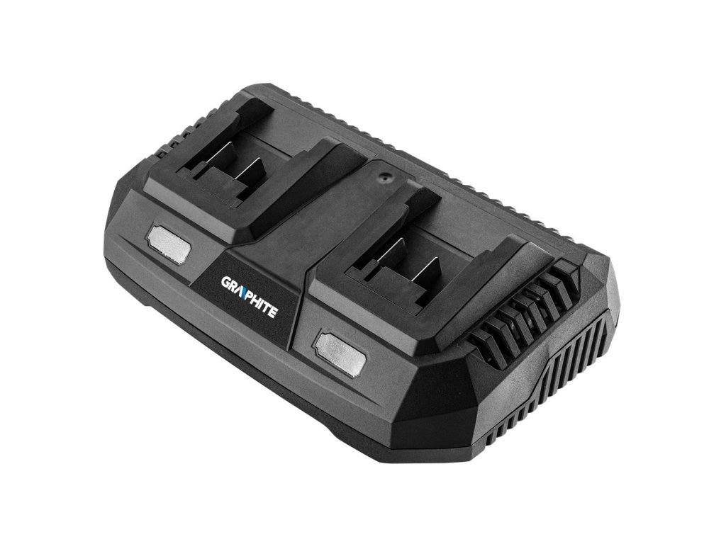 GRAPHITE Energy+ 18V Li-Ion nabíjačka batérií, maximálny nabíjací prúd 2 x 3A, 58G001 doba nabíjania batérie je 45min,2x4A 58G004 doba nabíjania batérie je 90 min2x6A 58G086 doba nabíjania batérie je 135 min. Ľahko čitateľné LED diódy označujú pripojené napätie. Je vybavený systémom regulácie napätia a teploty pre plnú batériu a ochranu používateľa. Zariadenie je vybavené flexibilným a odolným napájacím káblom v gumovom povlaku s dĺžkou 2 m.
