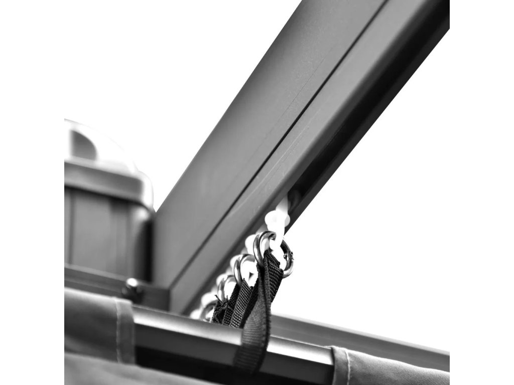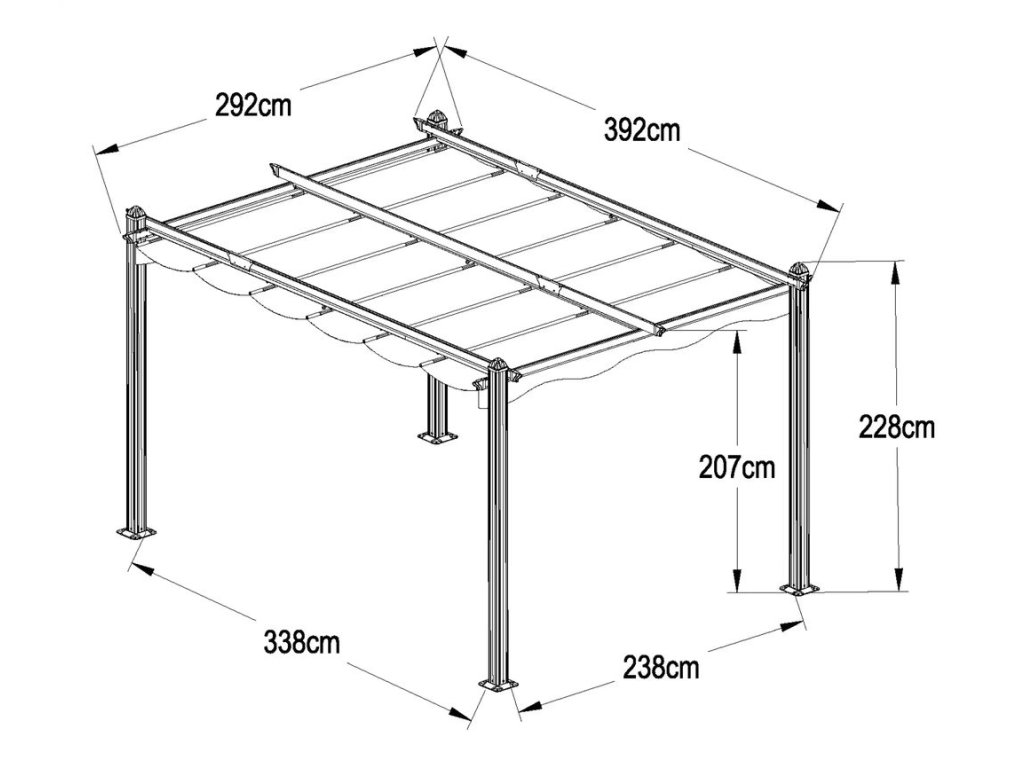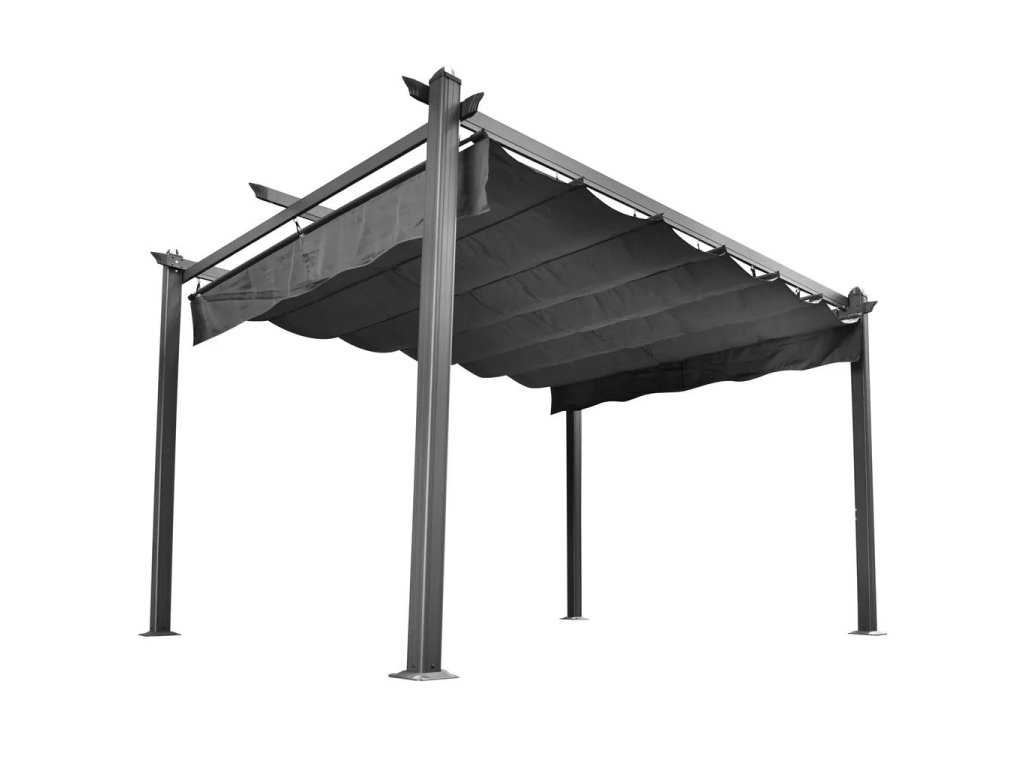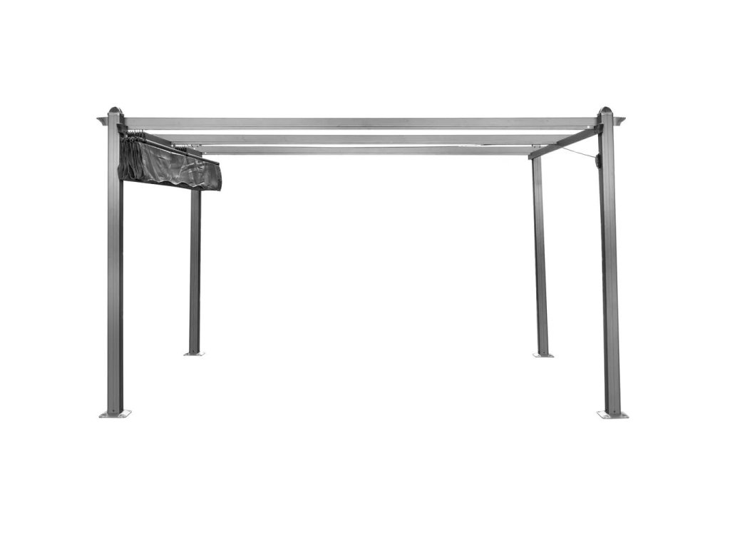 Luxusná záhradná pergola vám poskytne v horúcich letných dňoch príjemný tieň. Robustný rám je vyrobený z ľahkého hliníka opatreného odolným práškovým lakom. Nohy sú vyrobené z 1,1 mm profilu 10 x 10 cm, so základňami pre ukotvenie s rozmermi 20 x 20 cm. Plachta z 160 g polyesteru je sťahovacia, je pripevnená na 7 tyčiach uchytených v pojazdných závesoch. To umožňuje jednoduchú manipuláciu s plachtou podľa potreby.
