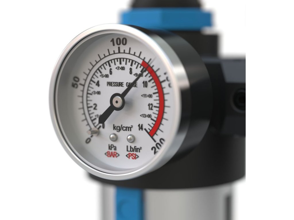 Redukčný ventil s vnútorným pripojovacím závitom 3/8" reguluje a stabilizuje tlak stlačeného vzduchu, aby sa zabezpečilo, že zariadenia v pneumatickom systéme budú pracovať v bezpečnom a optimálnom rozsahu tlaku, aby sa zabránilo poškodeniu pretlakom a aby sa zvýšila efektivita práce. Čistí a filtruje stlačený vzduch. Priehľadné záchytné sklo (PVC). Vrátane vypúšťacieho ventilu a manometra.