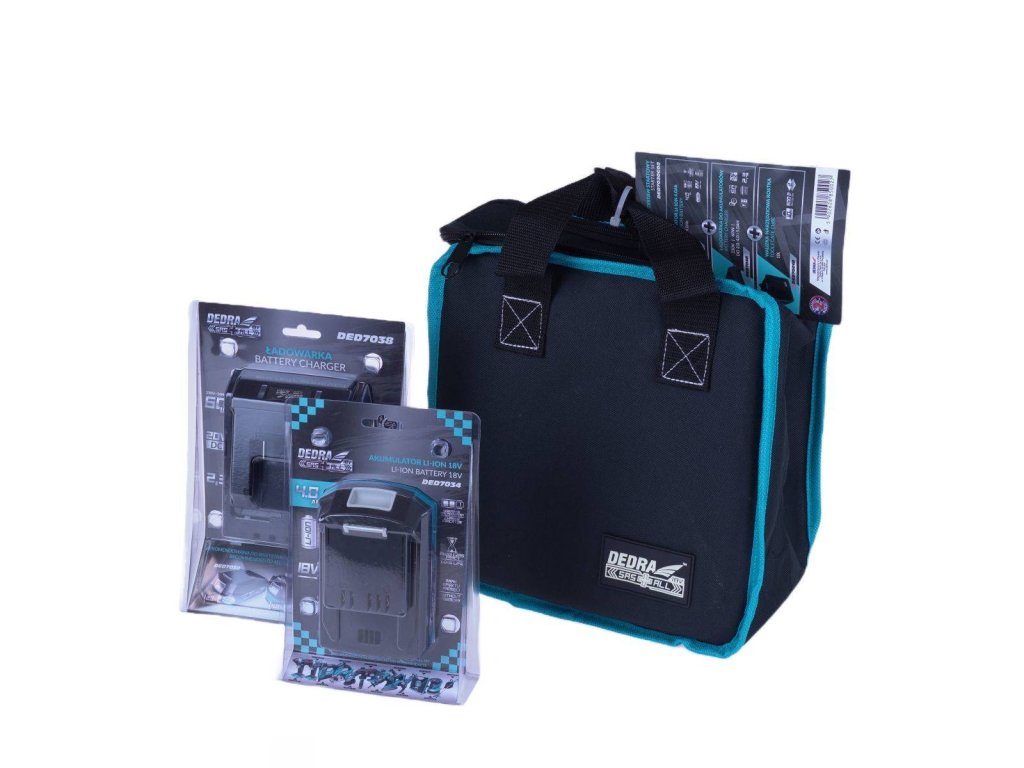Nabíjačka DED7038 je určená na nabíjanie batérií SAS+ALL (DED7032, DED7034, DED7035). Batériu s kapacitou 2,0 Ah je možné nabiť za 1 hodinu, batériu s kapacitou 4,0 Ah za 2 hodiny a batériu s kapacitou 5 Ah za 2,5 hodiny. Nabíjačka je vybavená dvoma LED diódami: jedna indikuje pripojenie k sieti a druhá ukončenie nabíjania.