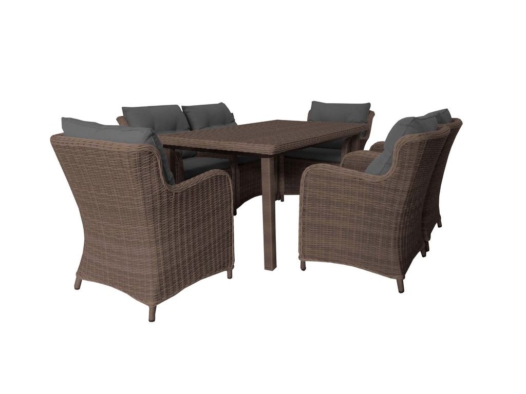 Luxusná záhradná zostava šiestich kresiel a jedného stola, vyrobená z veľmi kvalitnej hliníkovej konštrukcie a umelého ratanu. Vhodné pre exteriéry aj interiéry. Vrátane čalúnenia.
