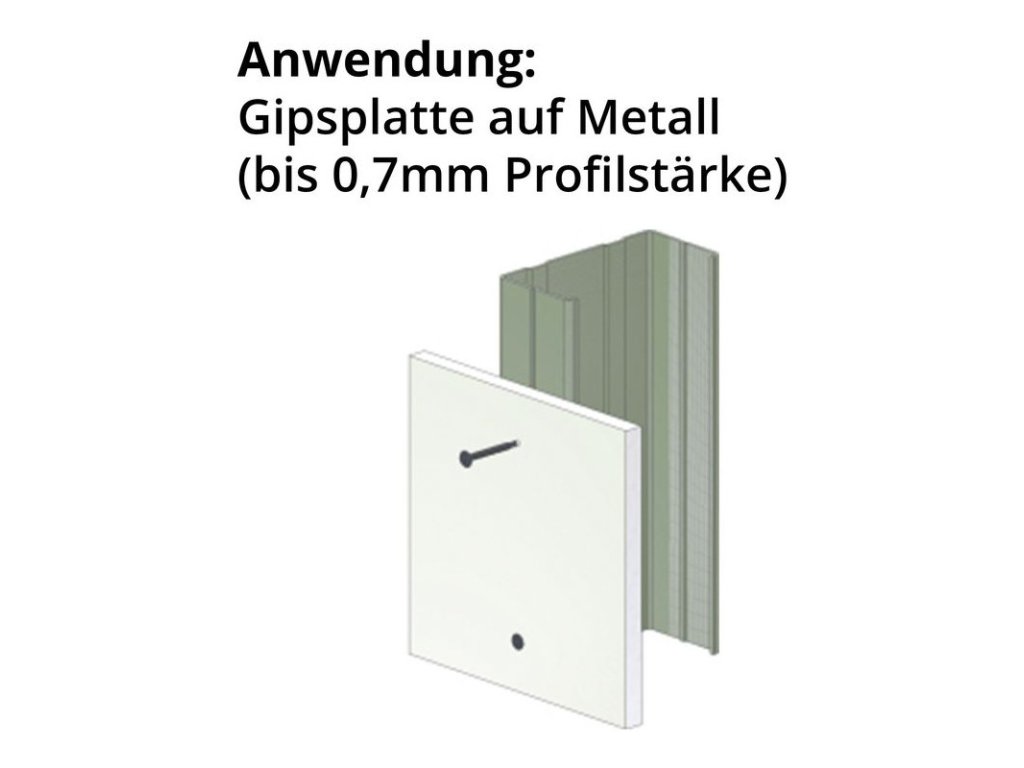 V balení 1000 skrutiek (20 zásobníkových pásov, každý pás obsahuje 50 skrutiek), dlhý spojovací pás, zásobníkové pásy vysokej kvality, s fosfátovým povrchom. Zhotovené podľa EN 14566. Na montáž sadrokartónových dosiek na kovové profily, do hrúbky profilu 0,7 mm.