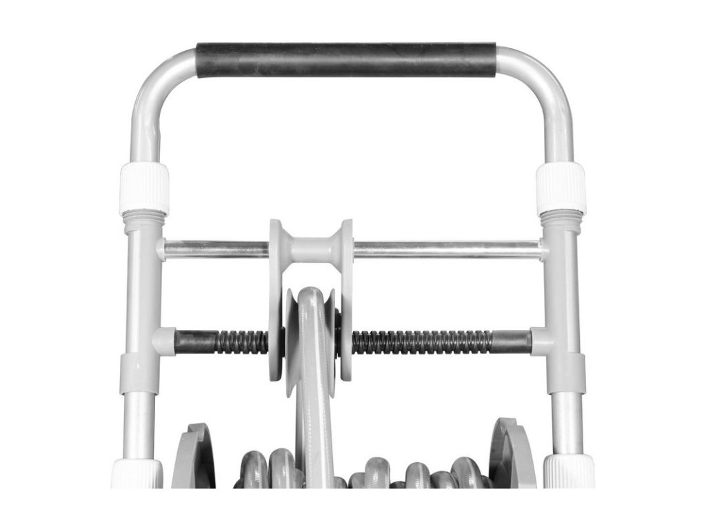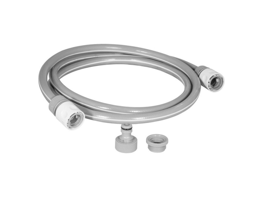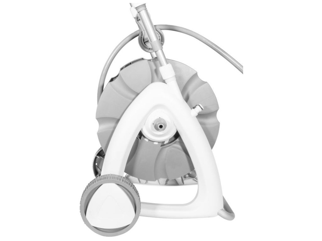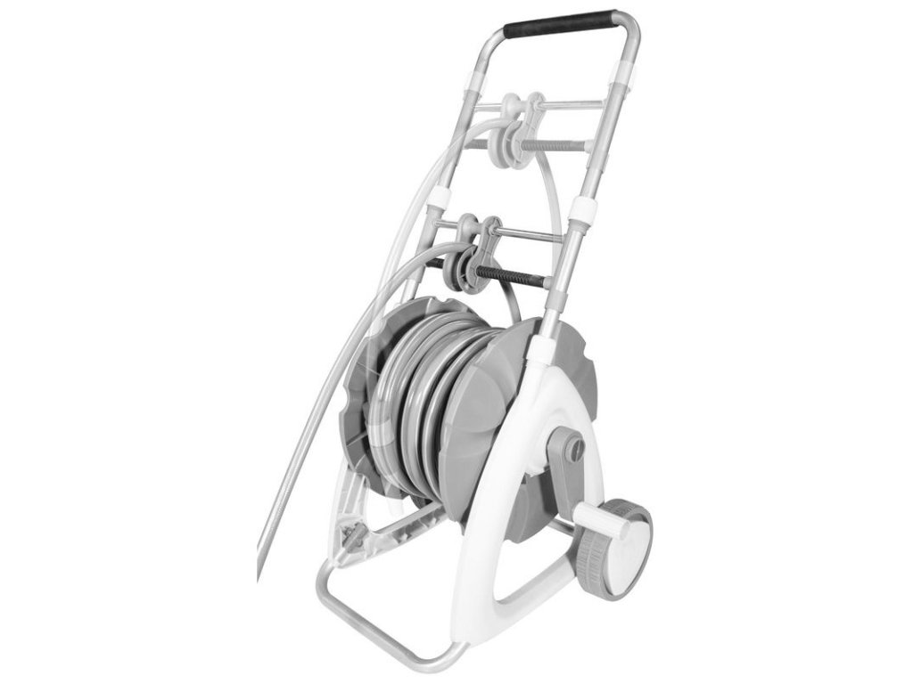 Vozík s 30 m hadicou s výpletom, teleskopická rukoväť 640 - 845 mm, 3 rýchlospojky, pripojovací kus pre rýchlospojku pre 3/4" IG / 1/2" IG, striekačka, kľuka pre jednoduché navinutie hadice, plávajúce vedenie hadice - tým sa hadica navíja po vrstvách, kolesá o priemere 145 mm pre jednoduchý presun, mäkká rukoväť.
