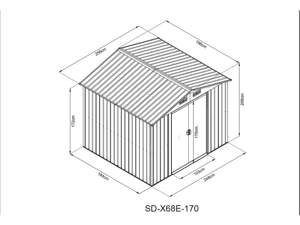 Výška dverí tohto domčeka je 1700 mm, vďaka posuvnej konštrukcii nemôže dôjsť k ich vyvráteniu a poškodeniu napríklad nárazom vetra. Šírka otvorených dverí je 1030 mm. Šikovné odvetrávacie mriežky zaistia ventiláciu vzduchu. V domčeku sa tak nemôže hromadiť vlhkosť, čím sa zamedzí zbytočnej korózii uskladneného materiálu a náradia.