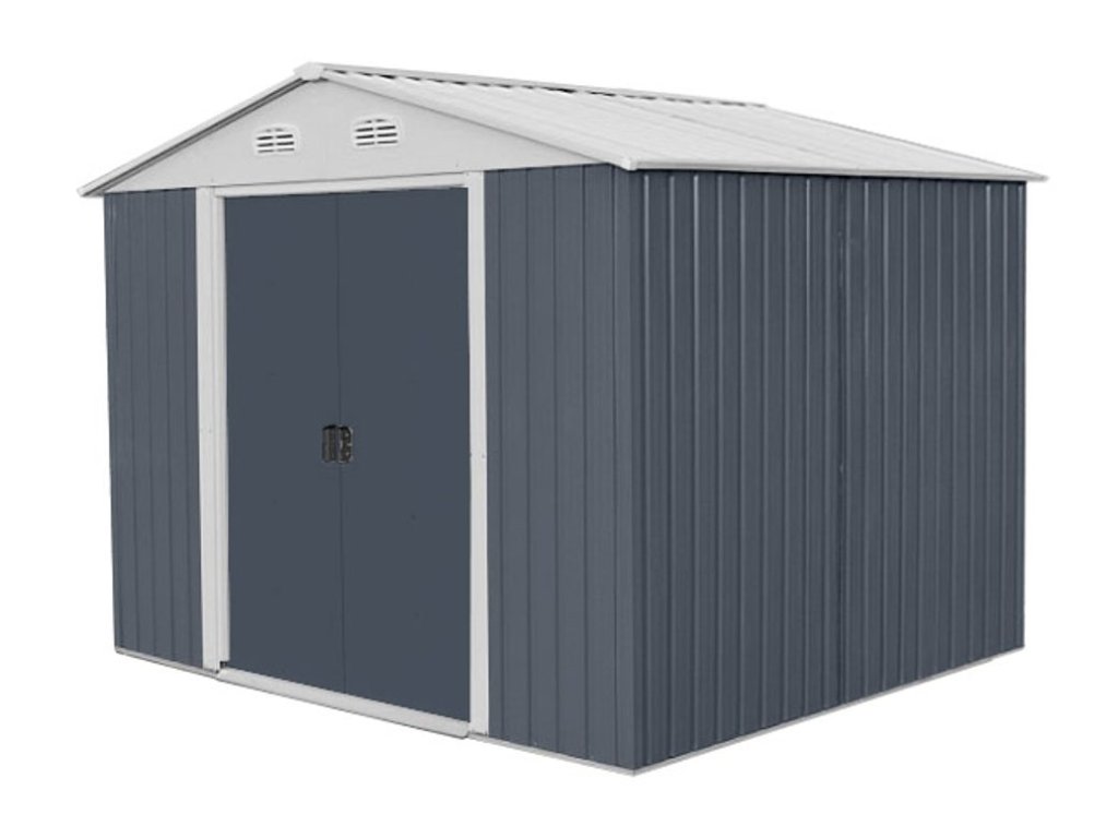 Kvalitný záhradný domček s odolnou konštrukciou v kombinácii šedej a tmavo šedej farby. Rozmery vrátane presahu strechy sú 1960 x 2580 mm.